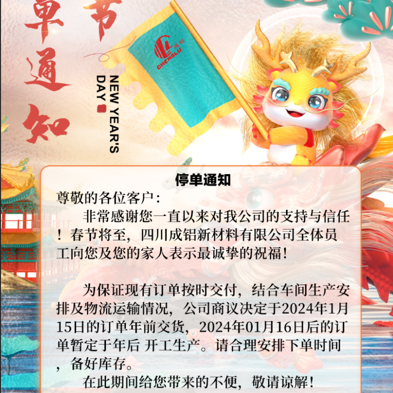 1 月102024 停单通知 新闻资讯By adminLeave a comment 尊敬的各位客户: 非常感谢您一直以来对我公司的支持与信任!值此新春佳节来临之际,四川成铝铝业科技有限公司全体员… 阅读详情
