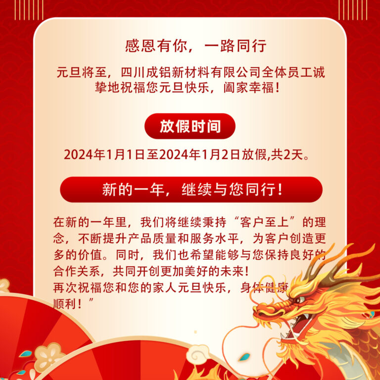 1 月12024 元旦放假通知 新闻资讯By adminLeave a comment 元旦将至,四川成铝铝业科技有限公司全体员工诚挚地祝福您元旦快乐,阖家幸福! 在过去的一年中,感谢您对我们公司的… 阅读详情